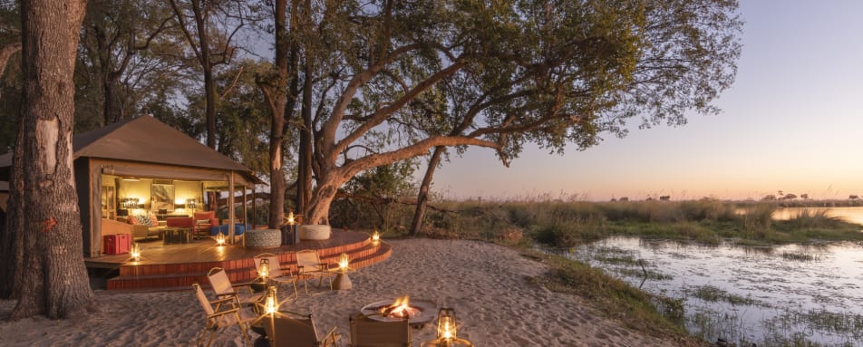 Footsteps camp is located on the edge of a beautiful lagoon in the north of Botswana's Okavango Delta, where highly vocal hippos wallow. The three traditional safari tents are shaded by magnificent evergreen trees including Africa ebony and mangosteen.