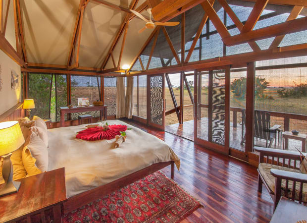The tented suites are spacious and comfortable, each have a reading and writing area, en-suite bathrooms with Victorian clawfoot bathtubs, "his and hers" washbasins and flush toilets. The bathrooms lead out to a reed enclosed open-air shower with hot and cold running water.  Each tent has its own sundeck, and is set back among the trees.