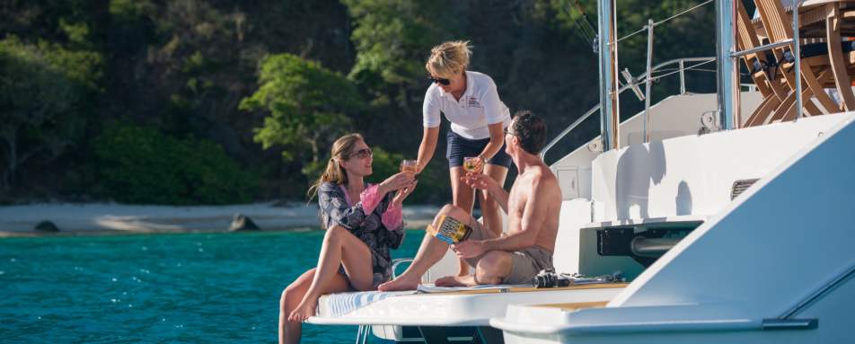 From here, sit down with your skipper and host with a chart and a drink, and plan your stay. Your crew know the area like the backs of their hands, and there is no procession of yachts from one marina to another – you are free to tailor your stay on board exactly as you please. Settle into your en-suite cabin and then enjoy a cocktail on the deck. The crews are experts at discretion and are equally happy spending time telling tall tales of the sea or quietly receding to their separate cabin if they sense you would like to spend some time alone – leaving you suitably topped up with a rum cocktail, of course! Sleeping accommodation is compact, not palatial, but you’ll find you spend the vast majority of your time on deck soaking up the sun, or in the airy saloon. Provisioning on board is taken care of by your crew, and all food and drink will be tailored to your preferences.