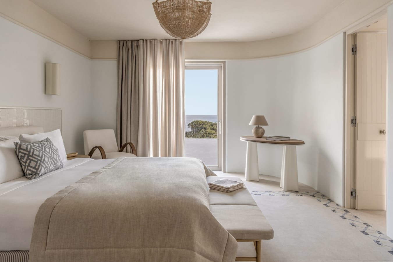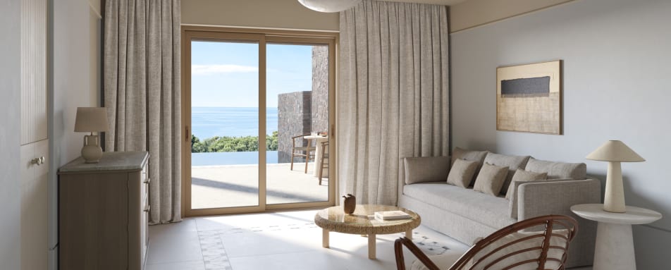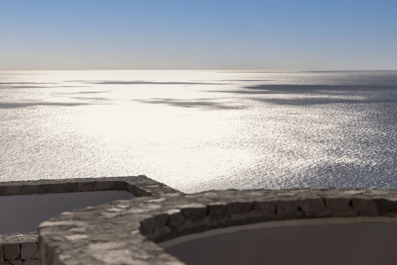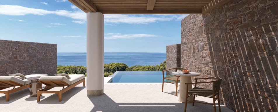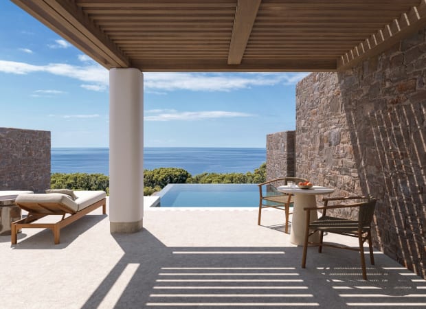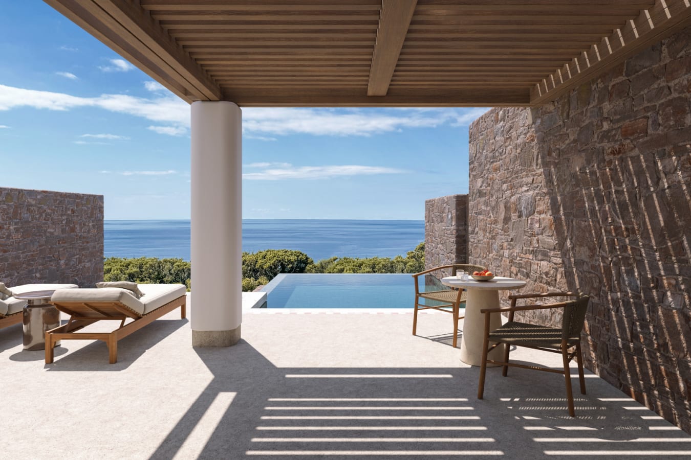 All 41 suites feature private pools and uninterrupted panoramic views of the Aegean Sea.