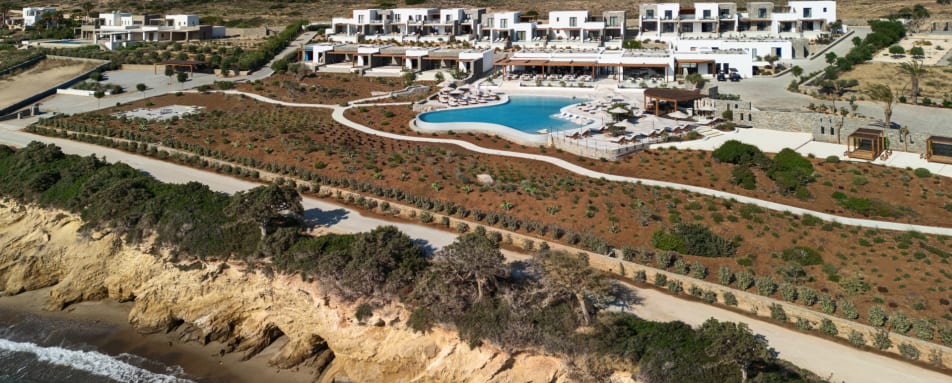 Set on the sun-drenched shores of Ambelas, just a quick seven-minute drive from the vibrant fishing village of Naoussa, Vione Paros is an adults-only (14+) five-star sanctuary where Cycladic style meets relaxed Mediterranean elegance. Perched on a cliff with sweeping views across the Aegean Sea and the distant island of Naxos, this sleek retreat offers the perfect balance of privacy and proximity to Paros’s best beaches, tavernas, and cultural gems.