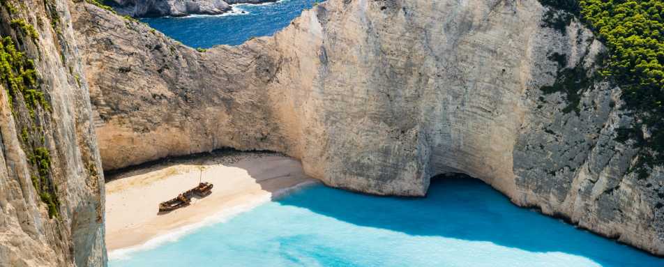 The most famous landmark of the island is the Navagio beach. It is a cove on the southwest shore, isolated by high cliffs and accessible only by boat. The white pebbled beach and sea floor surrounded by turquoise waters, is named after a shipwreck (MV Panagiotis).