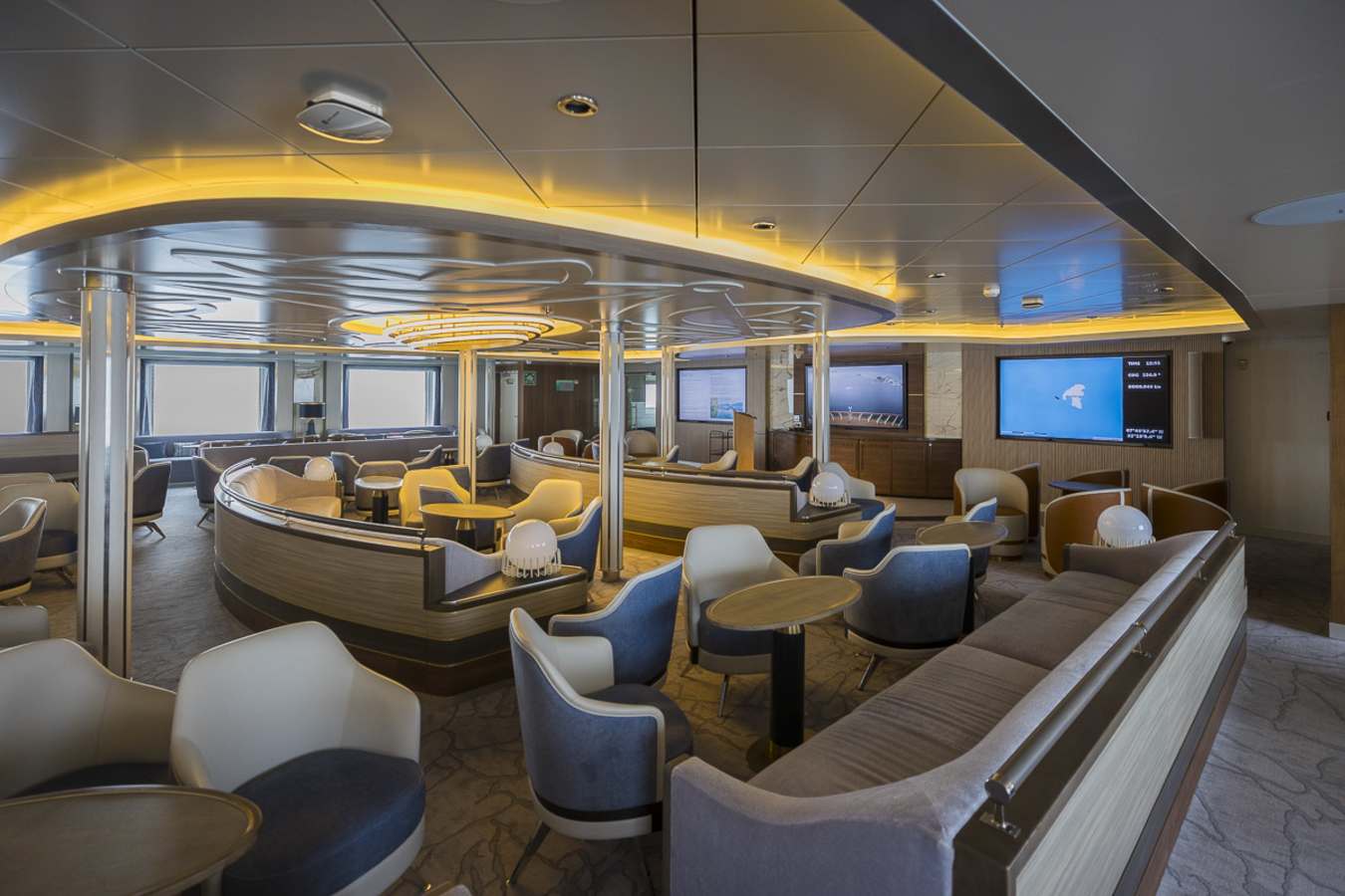 The onboard facilities range from a heated saltwater pool and jacuzzis on deck to a state-of-the-art lecture theatre, well-stocked library, convivial bar, and wellness centre.