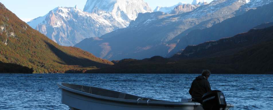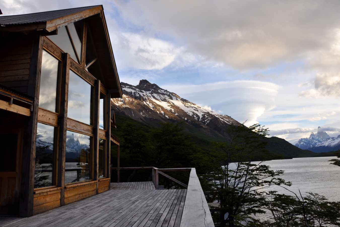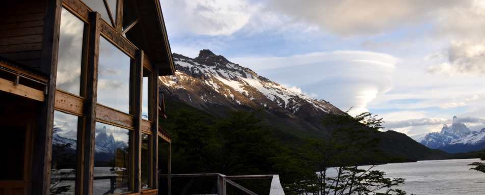 The lodge is around 37 km away from El Chalten overlooking Lago del Desierto from a sheltered position in the Antarctic beech forest. Its construction was a true labour of love with each item brought in by boat or by foot. Hand-built from natural wood and stone, the lodge offers a stunning portrait of the natural surroundings: an emerald green lake, hanging glaciers, forests and spectacular views of the Fitzroy massif.