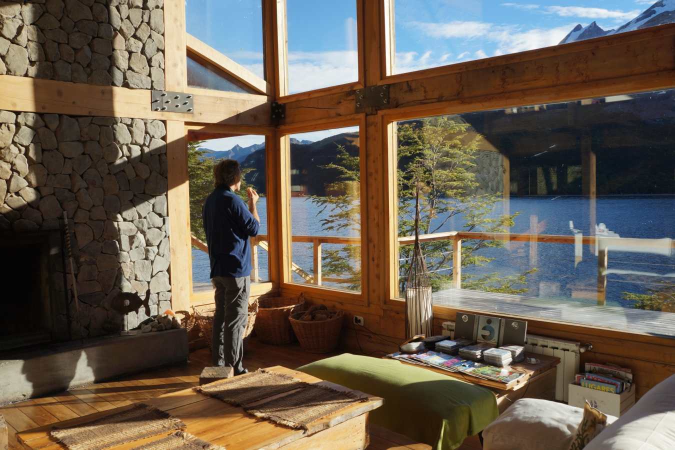 Aguas Arriba Lodge set deep in the spectacular heart of Patagonia, overlooks a lake and hanging glacier. With wonderful hosting, just six rooms and accessible only by boat or on foot, it makes a superb base for wilderness hiking, fishing or relaxing.