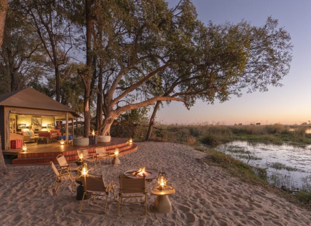 Footsteps camp is located on the edge of a beautiful lagoon in the north of Botswana's Okavango Delta, where highly vocal hippos wallow. The three traditional safari tents are shaded by magnificent evergreen trees including Africa ebony and mangosteen.