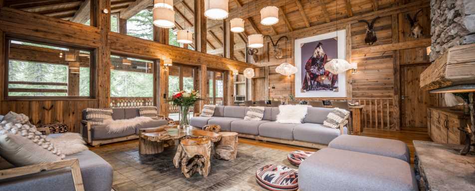 A sumptuous and elegantly styled chalet with enormous windows and double-height ceiling
