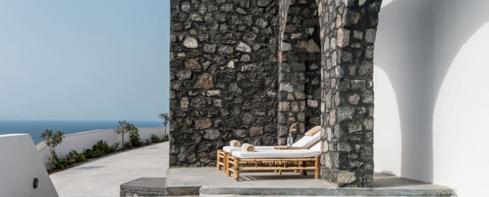 The decadent Alios Ilios restaurant overlooks the main infinity pool and the vast ocean views behind it, serving Mediterranean-fusion cuisine with a strong Cretan influence from chef Manolis Mattheakis. Near the pool is the Akratos Poolside Bar serving signature homemade cocktails and snacks perfect to sit and relax waiting for the famous sunset spectacle. Submerged in the hotel's tranquillity you wouldn’t know that you are just a five-minute walk away from the beautiful and buzzing village Oia, the best-known village of Santorini. The village is situated on top of an impressive cliff and offers a spectacular view over the volcano and the island of Thirassia and is very much a traditional village with charming houses in narrow streets, blue-domed churches, and sun-bathed verandas. Its streets have plenty of restaurants, cafes, shops and boutiques.