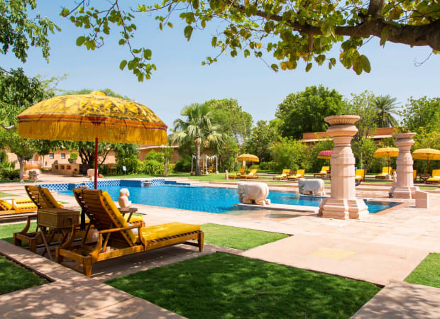 The Kohinoor Villa is a private oasis spread over 1057sqm, with gardens, a large heated pool, an outdoor dining pavilion and elegantly appointed individual accommodations. Each Kohinoor Villa measures 1057sqm. There is a master bedroom with an adjoining lounge area, an additional guest bedroom and a separate spacious living room opening out onto the gardens and pool. Each of the bedrooms has an en suite bathroom with sunken marble bathtubs and beautiful views of private walled gardens. Elegant furniture, exquisite upholstery and the warm interiors filled with artifacts and coffee-table books create a personal, royal, yet welcoming living space.