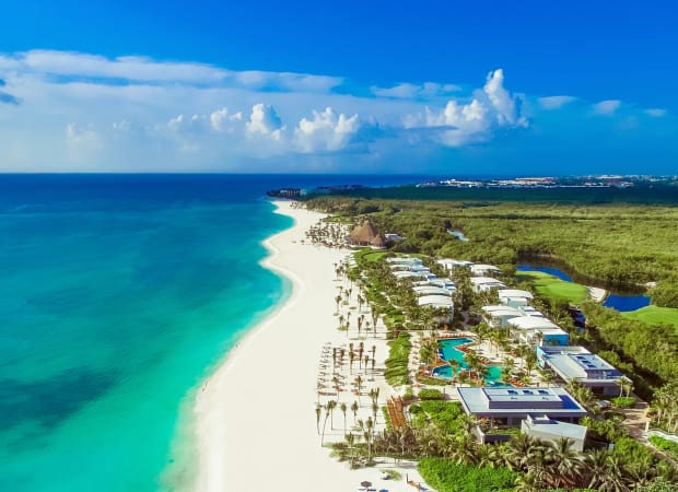 Two outdoor pools make the most of the Mexican sun, while the indulgent Naum Wellness and Spa boasts two hydrotherapy areas and six treatment rooms for relaxing rituals and innovative facial treatments. The Kimbo Kids Club keeps children between 4 and 12 years old entertained while their parents enjoy a round of golf on the Greg Norman designed PGA course, El Camaleón Golf Club.