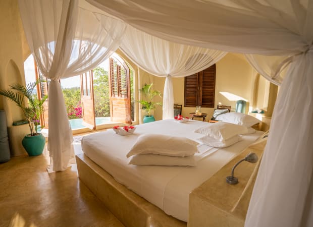 Each domed residence offers guests a serious amount of space including a small courtyard garden, two plunge pools, outdoor daybed, huge wet room and, of course, a beautiful bedroom with floor-length shutters opening onto a stunning tropical view.