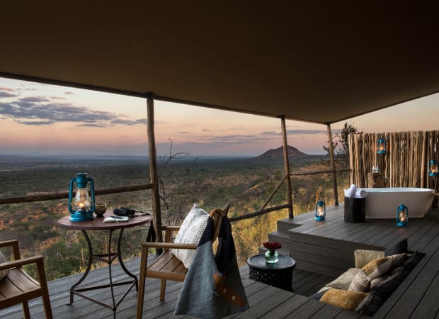 The 15 tented suites boast a private bath on the deck, a dreamy spot for a post-game drive dip without leaving the picturesque scenery