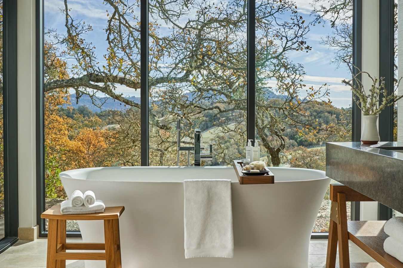 For those wishing for more space, The Guest House is the perfect option with three bedrooms, a large separate living room and a fully-equipped kitchen and pantry. The Guest House also features an expansive courtyard with both an outdoor hot tub and fire feature, as well as enviable views of both the Alexander Valley and Mount St. Helena.