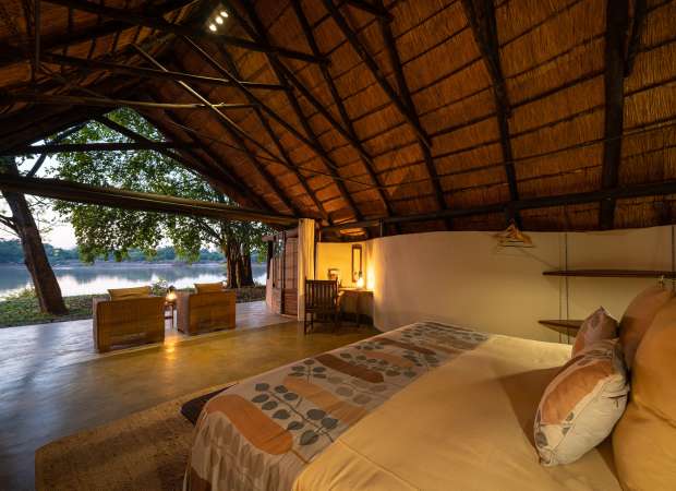 Nkwali Camp sits under the shade of mahogany, ebony and sausage trees, on the banks of the Luangwa River. Just outside the South Luangwa National Park, Eastern Province of Zambia.