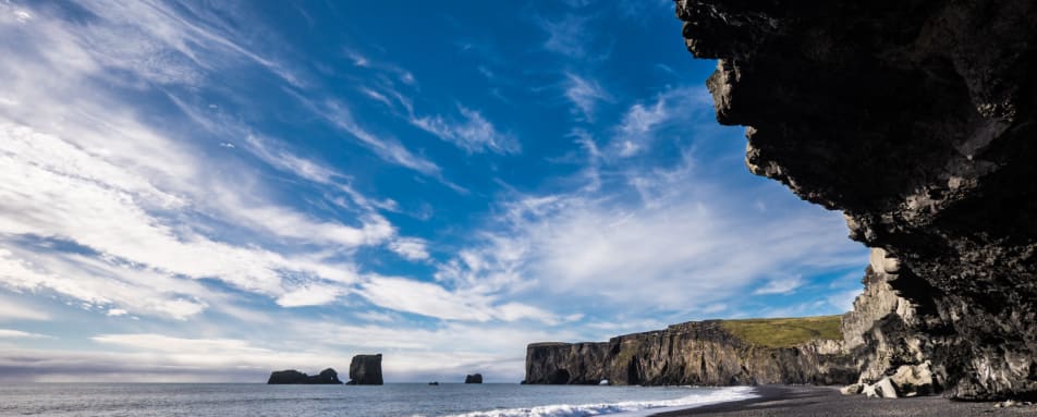 You can expect to see the iconic black sand beach of Reynisfjara. As you walk along the jet black sand, you will be able to spot the Reynisdrangar rocky sea stacks which, according to legend, are trolls turned to solid stone at sunrise as they tried to drag ships from the ocean to the shore. You will also get to visit the charming coastal village of Vík í Mýrdal, whose picturesque church enjoys glorious ocean views. Nearby is Dyrhólaey; a 120m high natural rock arch, which serves as a bird sanctuary in summertime. You will also get to see some of Iceland’s most impressive waterfalls, including Seljalandsfoss and Skógafoss, where you'll find a winding staircase leading to the top of the falls, offering a birds’ eye view of this natural marvel.
