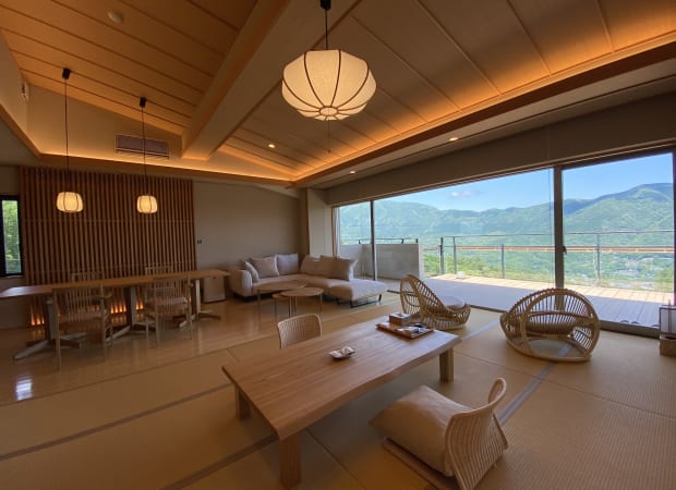 Each of the six suites has a glass floor-to-ceiling wall with incredible mountain views. Lounge areas have traditional tatami flooring, large table, sofa, oversized TV and separate bedroom with Western beds. Equally spacious is the terrace with private outdoor onsen. The large bathrooms have separate WC and guests also have an indoor onsen to enjoy.