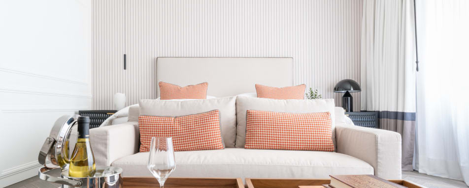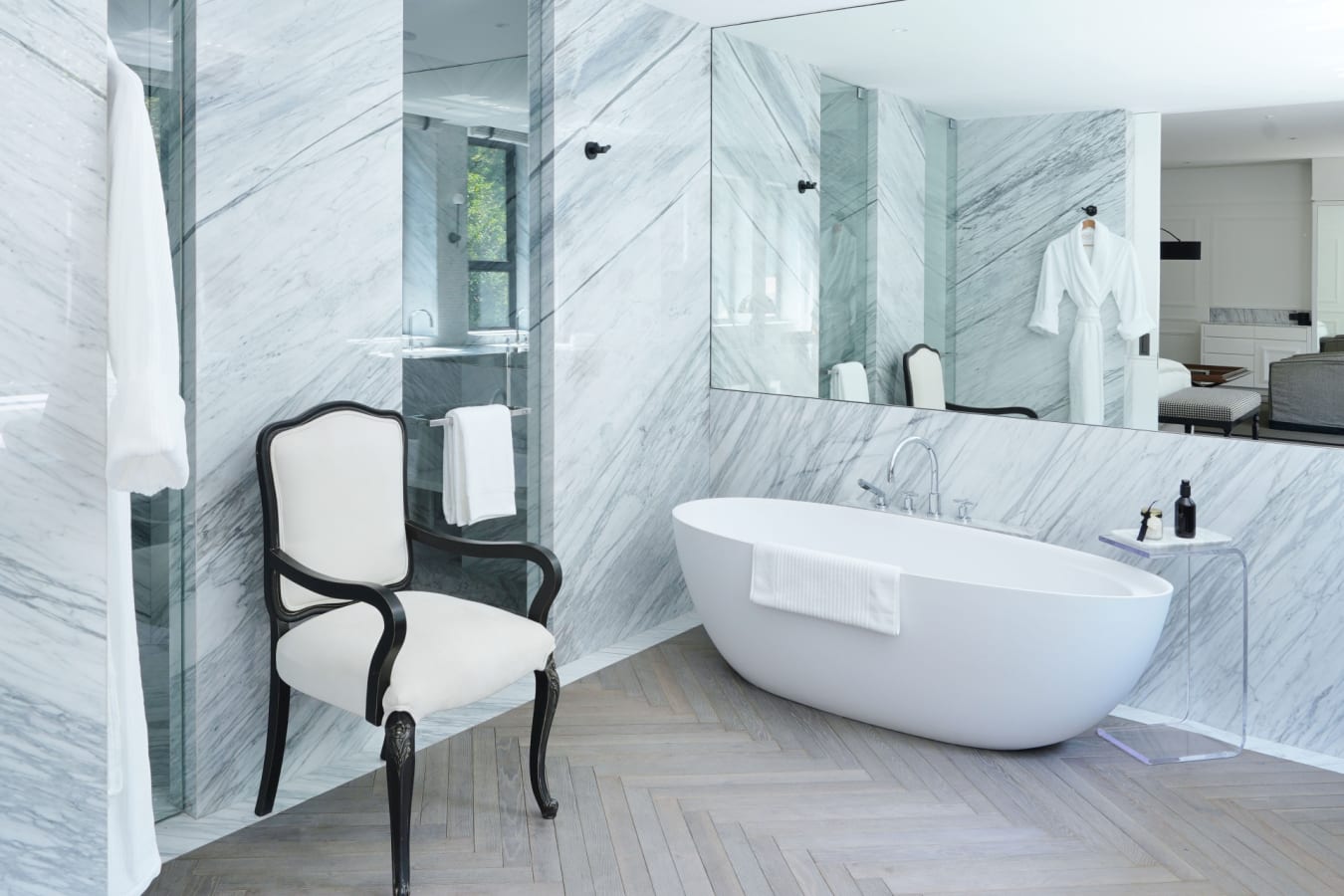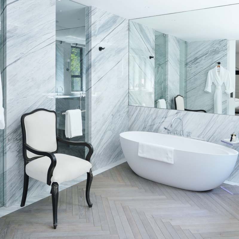 • Spacious rooms with king-sized beds, high-end linens, marble bathrooms, and more.