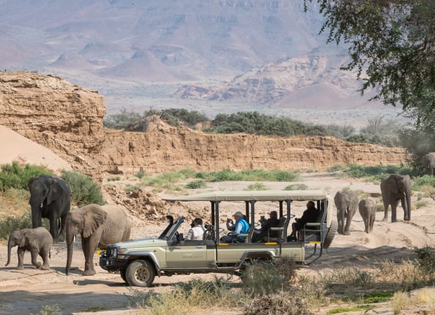 Guests can enjoy game drives and walks with expert guides who take safaris early in the morning or in the evening and into the night to spot nocturnal species that cannot be seen during daylight hours. Large game is not concentrated year-round here, with the natural cycle of rainfall dictating the seasonal movement of wildlife along the Huab River. Activities at Damaraland Camp revolve around exploring the Huab River system. The morning and afternoon drives go in search of desert-adapted elephant, gemsbok, greater kudu, springbok, and occasionally lion, cheetah and black rhino can be spotted. Interesting flora such as euphorbias and shepherd's trees can be viewed on the way to some of Africa's best known rock engravings, including the famous Twyfelfontein etchings.