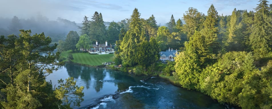 Supremely situated on 8 hectares of private parkland on the bend of the mighty Waikato River, the luxury, iconic Huka Lodge is a haven of hospitality, tranquillity and activities in an unrivalled riverside location on the outskirts of Taupo.