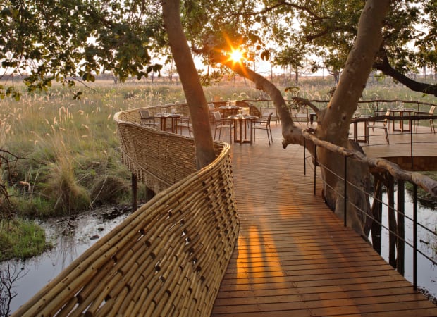 The central dining and sitting area is tucked under a towering canopy of trees, with a curving, flowing roof shaped like the armour of a pangolin. Here you'll find sunken lounges and quiet decks affording views across the waterways. The bar, on a higher level, is created from hundreds of strips of curving white wood, and leads to a long deck stretching out towards the waters - perfect for private dinners. A shaded swimming pool and well-stocked safari shop are close by. Pan-African dinners are prepared and served either around the fires which are lit in the cooler months, or outside under the stars.