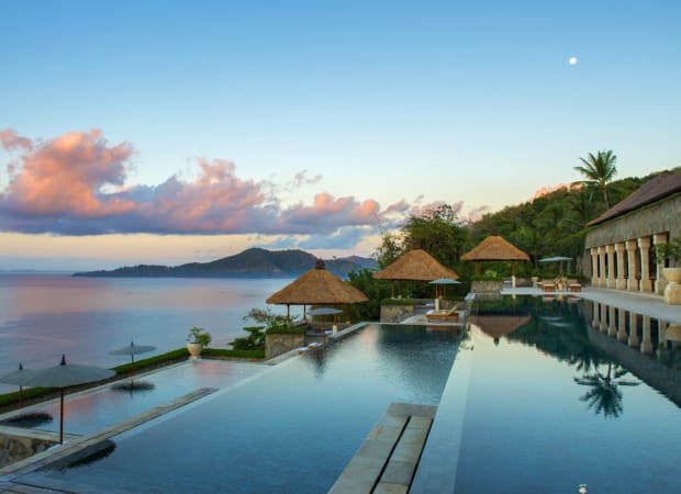 Amankila is dotted around the verdant cliffs of Indrakila with views overlooking the Lombok Strait, near Manggis in the Karangasem Regency of eastern Bali, Indonesia.