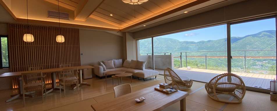 Each of the six suites has a glass floor-to-ceiling wall with incredible mountain views. Lounge areas have traditional tatami flooring, large table, sofa, oversized TV and separate bedroom with Western beds. Equally spacious is the terrace with private outdoor onsen. The large bathrooms have separate WC and guests also have an indoor onsen to enjoy.
