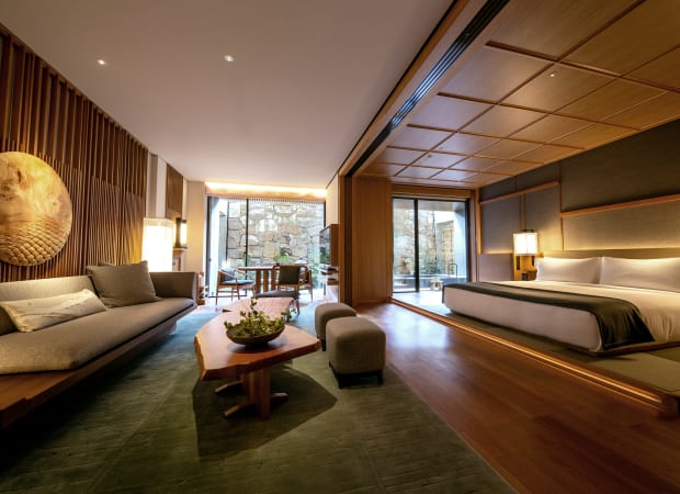 The Mitsui has 161 rooms and suites, all designed with a nod to Japan’s traditional teahouses, featuring pale birch wood, light-green carpets, walnut furniture, and silk headboards. Light stone bathtubs and amenities by Parfum Satori add to the sophisticated vibe. There are four categories of room – Deluxe, Premier, Garden and Nijo, depending on how much space you require. Guests can choose rooms facing the gardens, the city or Nijo Castle itself. For extra room trade up to one of the 22 suites, which include two Onsen Suites, with private outdoor onsen bathing.