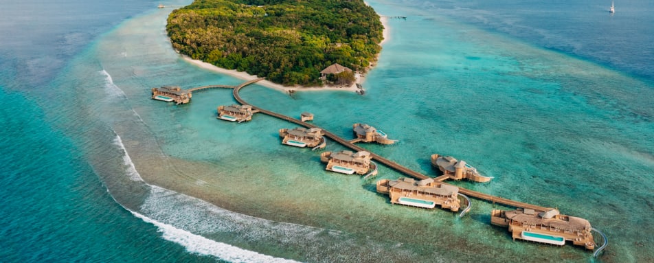A scenic seaplane journey from Malé delivers you to this private hideaway, where villas crafted from reclaimed wood and palm thatch are hidden in the foliage or set along the shore. From romantic one-bedroom retreats to the vast Nine Bedroom Private Reserve with its own spa, gym and waterslide, each offers space, privacy and barefoot luxury.