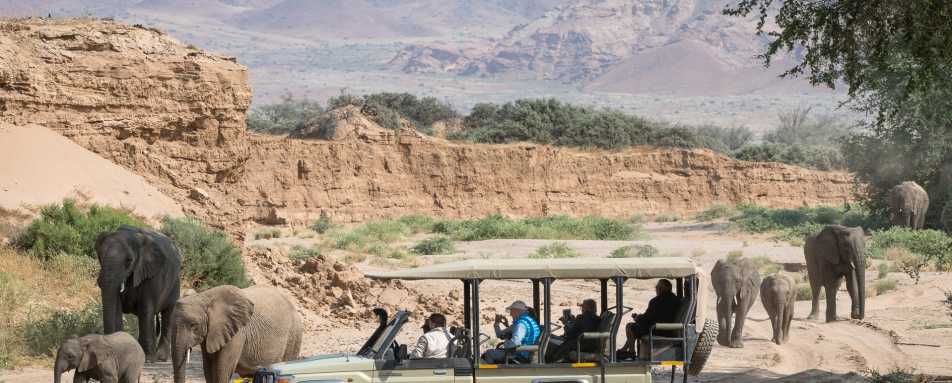 Guests can enjoy game drives and walks with expert guides who take safaris early in the morning or in the evening and into the night to spot nocturnal species that cannot be seen during daylight hours. Large game is not concentrated year-round here, with the natural cycle of rainfall dictating the seasonal movement of wildlife along the Huab River. Activities at Damaraland Camp revolve around exploring the Huab River system. The morning and afternoon drives go in search of desert-adapted elephant, gemsbok, greater kudu, springbok, and occasionally lion, cheetah and black rhino can be spotted. Interesting flora such as euphorbias and shepherd's trees can be viewed on the way to some of Africa's best known rock engravings, including the famous Twyfelfontein etchings.