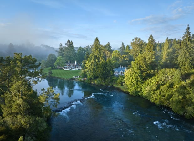 Supremely situated on 8 hectares of private parkland on the bend of the mighty Waikato River, the luxury, iconic Huka Lodge is a haven of hospitality, tranquillity and activities in an unrivalled riverside location on the outskirts of Taupo.