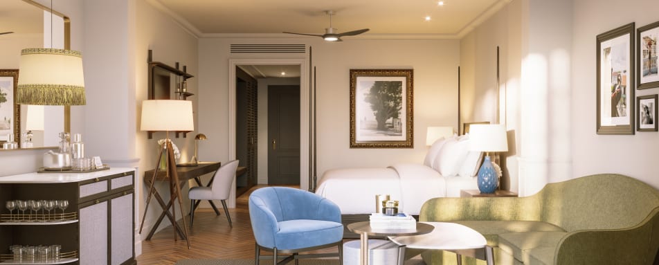 Expect high ceilings, mahogany wood panelling, sparkling chandeliers, plush sofas, low-slung wicker chairs, bistro booths, original artwork and delightful courtyard boasting swaying palms and gurgling fountains. The hospitality is exceptional with an experienced concierge and personal butler service to ensure the perfect stay. Despite the luxe vibe, sustainability is also a major consideration with no single-use plastic.