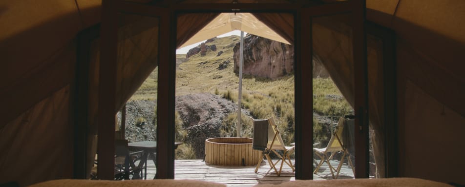 Days 12–13 | Tinajani: Remote Andean Landscapes & Fireside Evenings Continue to the remote highlands of the Puno region, where Tinajani Camp offers an intimate escape among sculpted red rock formations and sweeping Andean plains. Your private tent is comfortably appointed, providing warmth and shelter while maintaining a close connection to the surrounding wilderness.