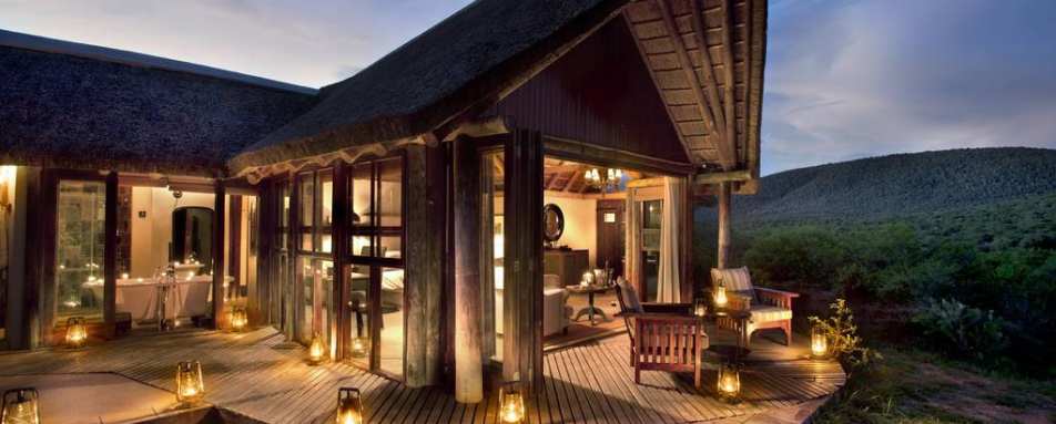 Kwandwe Game Reserve is situated in the non-malarial Eastern Cape. Great Fish River Lodge comprises nine luxurious thatched suites, each with its own private plunge pool, which are linked to the lodge by wooden walkways.
