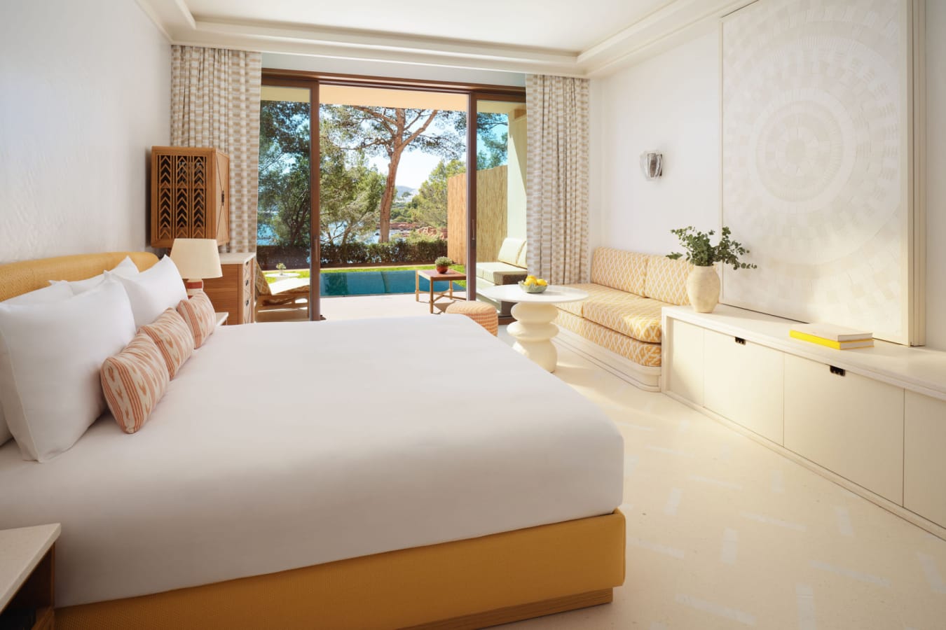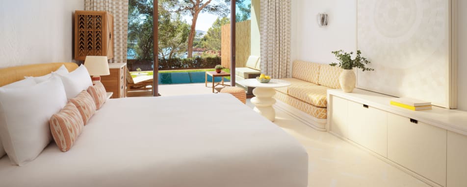 The hotel features a collection of beautifully appointed rooms, suites and villas, thoughtfully designed to reflect the surrounding landscape. Soft, natural tones and elegant materials create a sense of harmony, while floor-to-ceiling windows invite the outside in. Entry-level rooms offer garden or sea views with private terraces, while suites provide generous living space and enhanced privacy. For the ultimate escape, the villas boast private pools and expansive outdoor areas, ideal for families or those seeking seclusion.