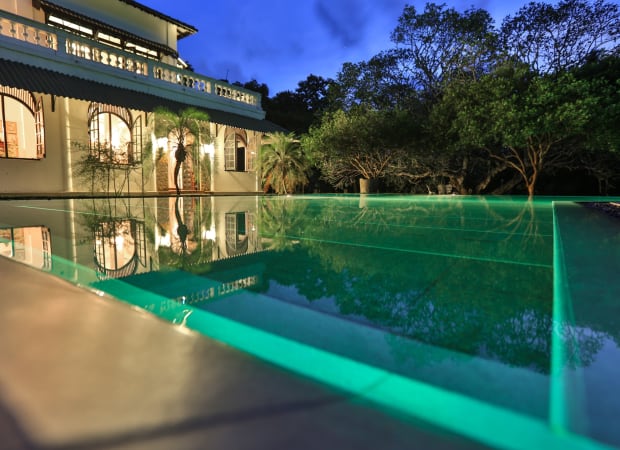 The estate offers spacious rooms furnished with period furniture and verandas opening out onto lush gardens. The house has three large suites and one two-bedroom family suite, all with en-suite bathrooms. The rooms are not air-conditioned but there are ceiling fans and all rooms have high roofs and large windows that let in the cooling tropical breeze. All rooms also have access to balconies or verandas and have elegant as well as comfortable interiors. The main living and dining areas open out to extensive gardens and a large pool.