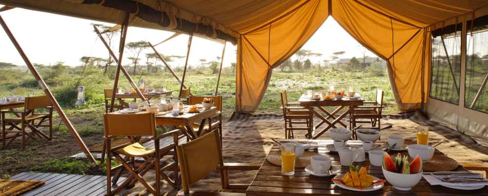 Serengeti Under Canvas offers two luxury mobile camps which roam the Serengeti plains and beyond, following the wildebeest as they migrate. Each semi-permanent camp has nine Meru style tents all with elegant finishes of Persian rugs and chandeliers.
