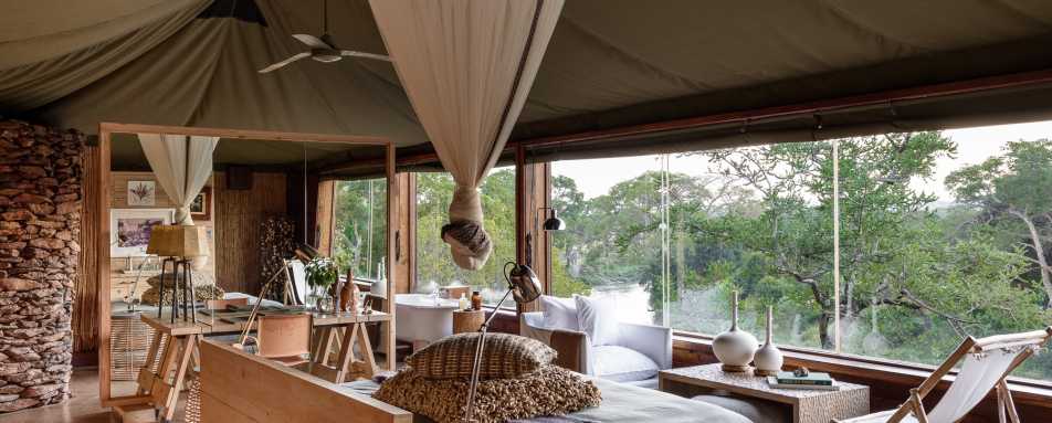Situated on a slope, basking in the abundance of animal species and birdlife around it, Singita's Faru Faru Lodge lends a contemporary signature style to safari. Inspired by a botanical theme, this riverside lodge offers barefoot elegance in a laid-back rustic setting.