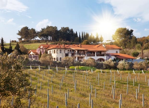 With a Mediterranean inspired design, the stone-built property lies surrounded by vineyards, olive groves and rolling hills
