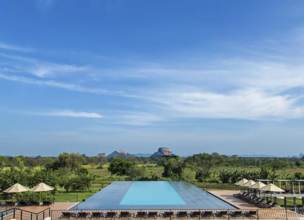 The lobby and pool area offer breathtaking views of the Sigiriya Rock Fortress and lush countryside