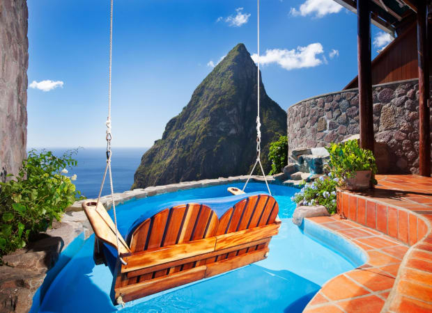 All rooms have a private plunge pool and overlook the famous Piton Mountains