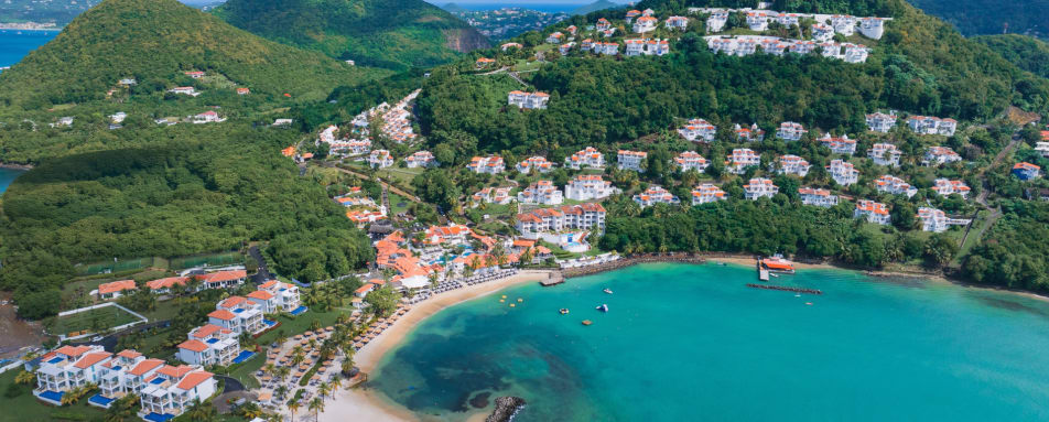 Perched on St Lucia’s northwest coast in Labrelotte Bay, Windjammer Landing spans 60 lush acres overlooking azure Caribbean waters and 64,000 sq ft of pristine white-sand beach. It lies just 15 minutes from Rodney Bay, 20 minutes from Castries, and about 90 minutes from Hewanorra International Airport