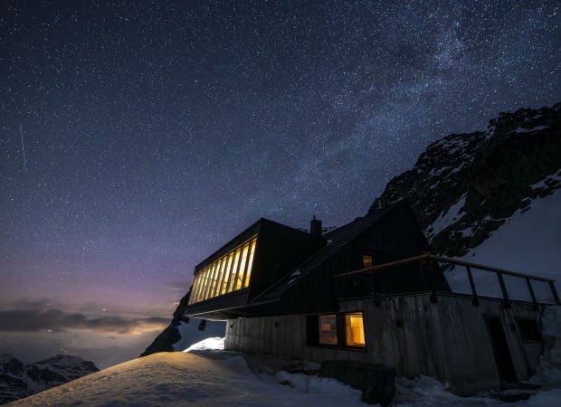 Perched at 3,000 metres on a rocky outcrop above the glacier of Tortin in the Swiss Pennine Alps, Cabane Tortin sits between the resort villages of Verbier and Nendaz in Valais. Fully secluded and accessible only by ski, gondola or snow-vehicle, it offers sweeping panoramas of jagged mountain peaks, complete privacy, and direct access to the 4-Vallées ski domain.