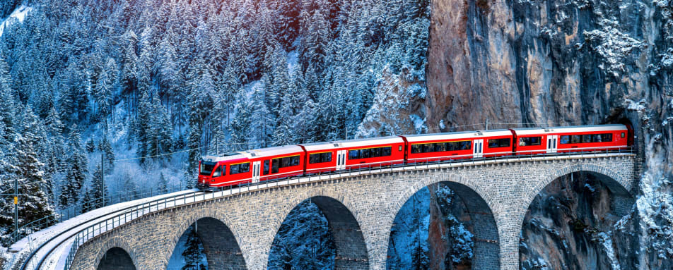 Travel through the Rhine Gorge, over the 2,033m Oberalp Pass, through 91 tunnels and over 291 bridges