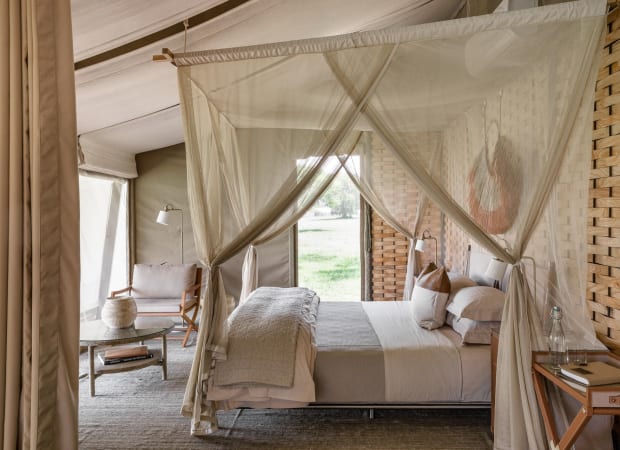 Singita Sabora Tented Camp is a small and very stylish tented camp set on the plains of the Grumeti Reserve. Decorated in sleek neutral tones, each of the nine tented suites include private pantries, ensuite bathrooms boasting a shower and deep bath tub, and a private terrace where guest can enjoy yoga or lounge on the day bed overlooking the waterholes.