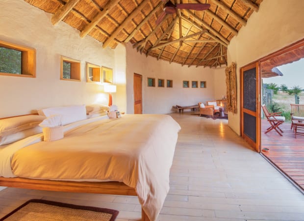 The camp is built in a crescent shape with the whole of the front completely open to take advantage of the views. There are canvas blinds though that can be rolled down whenever the weather gets chilly and a wood viewing deck curves around an open firepit area which is perfect for guests enjoying sundowners before or after dinner. There is also a small plunge pool to relax in during the heat of the day and watch the action at the waterhole.