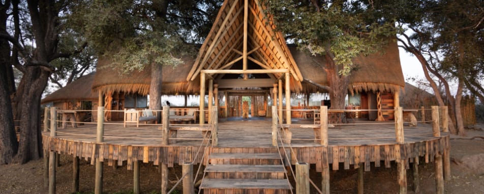 All the building materials have been salvaged and repurposed, allowing the camp to blend seamlessly into the natural environment. Set on a deck high in the ebony trees offering both shade and optimal wildlife viewing, the camp has been built using thick recycled woods, traditional thatch, and canvas in a style that echoes the oversized baskets used by the local fisherman. The main camp includes a communal lounge, dining area, bar, firepit, boutique selling local crafts, and swimming pool, while solar-powered air conditioning and fans keep guests cool.