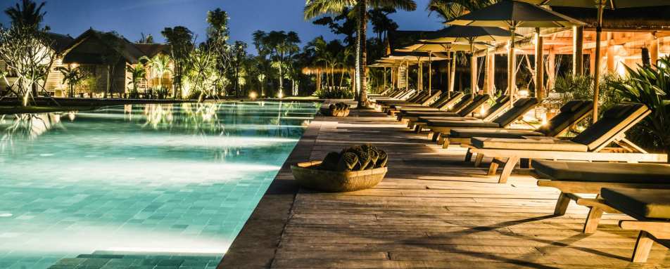 Gaze out over the paddy fields, mirrored in the infinity pool, as you lounge under the palms.