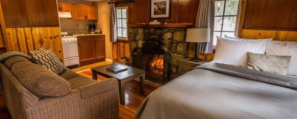 After a day of adventure, retreat to your cabin to relax by the wood-burning fireplace