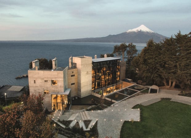 Perched on the banks of Lake Llanquihue, each room boasts floor to ceiling windows and stunning views over the shimmering waters, with the snow-capped Osorno Volcano in the distance.