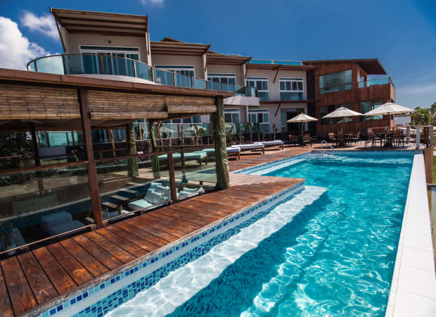 Outside there is a spacious deck with comfortable daybeds surrounding a small mosaic-tiled infinity pool, along with spectacular ocean views. Guests can also enjoy the views from the rooftop terrace and bar which features a hot tub, while massages can be arranged either in-room or on the beach.